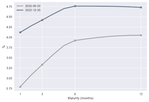 However, investing in T-bills presents a few problems. For starters, which maturity should you hold? If we plot the yields of T-bills as a function of their maturities we get a yield curve. The shape of the yield curve can vary over time. It can be upward sloping, downward sloping, or flat. Figure 1 shows the yield curve for two different dates.