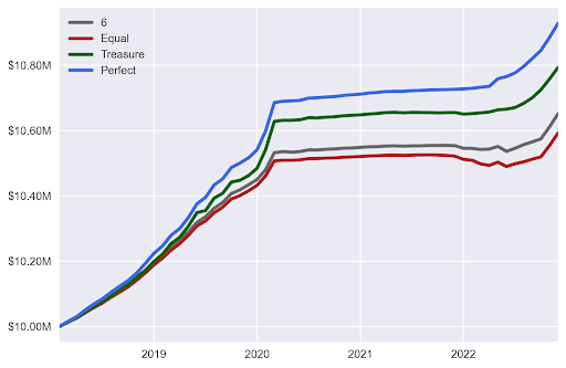 Again, it is not too surprising that Perfect is positive 100% of the time. The Treasure, Equal, and 6 portfolios are positive 94%, 80%, and 86% of the time, respectively.