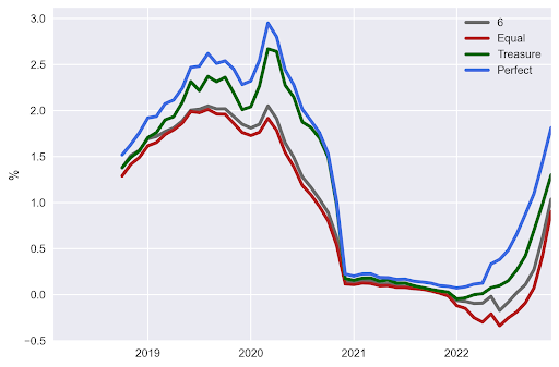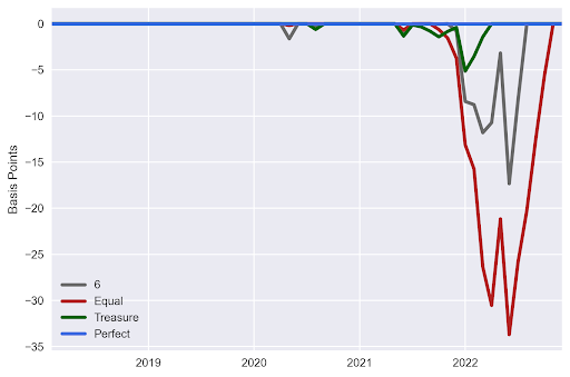 Drawdown refers to how much a given portfolio has lost from the most recent peak before it recovers. Not too suprisingly Perfect has no drawdown. However, it is interesting to consider the maximum drawdown for each of the other three strategies. Treasure and 6 have maximum drawdowns of 5 and 17 basis points compared to 34 basis points for Equal.