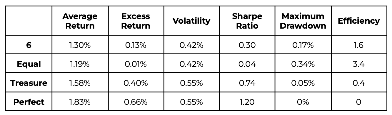 6 is the first benchmark (shown in gray) and is the performance of a static allocation to the 6-month T-bill. Equal is the second benchmark (shown in red) which is an equally weighted portfolio of 1-, 3-, 6-, and 12-month T-bills. Maintaining static or equally weighted portfolios is an extremely common investment strategy. However, it’s not the best solution. Perfect is the final benchmark (shown in blue) which is a perfect foresight strategy. This allocation cheats by looking ahead, one month into the future, and invests in the best performing T-bill. In practice, no model will be correct all of the time, however we see that Treasure is closest to Perfect and handily outperforms Equal and 6.
