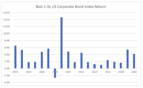 As it is true for any investment it is important to keep a disciplined and consistent approach over time. The biggest enemies of compounding are frequent and rash actions. Corporate bonds tend to produce positive annual returns, so the reward of such investments is realized by a commitment to the cash management strategy.