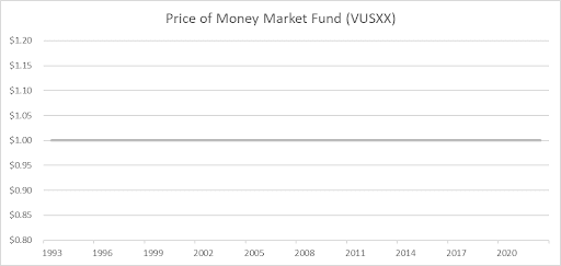 Because money market funds are so heavily regulated, they are granted the privilege of holding their value at a steady $1. Here is the price of the Vanguard Treasury Money Market Fund (VUSXX) through time: