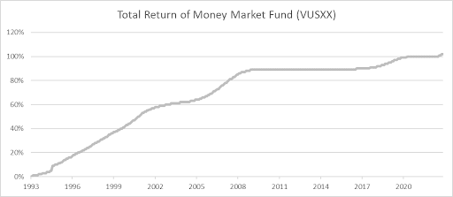 This is a very smooth return over time. Money market funds continually reinvest your money at the stipulated risk level, either allocating to short term government-backed debt securities only or short term corporate debt securities. This relieves you of the task of selecting new investments.