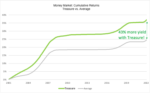 The simple answer, have an expert do it for you. There is a wide range of performance across money market funds, and it pays to be constantly allocating to the best performing ones. As the chart shows there is a 43% difference between the average money market fund and the ones Treasure is selecting for our customers.