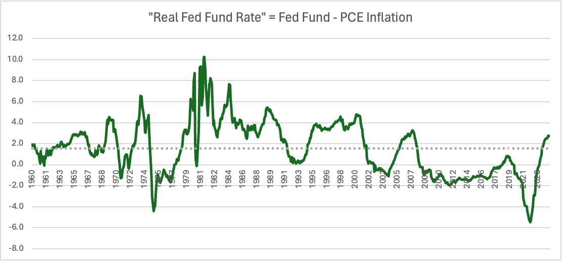 -Real Fed Fund rate: If we subtract the inflation from the Fed Fund rate we get what is called the “real Fed Fund rate”. Prior to September, the real Fed Fund rate was sitting at 3.00% (ie 5.50% - 2.50%). Based on the Fed forecast we can compute its future implied real Fed Fund rate which is expected to decline toward 0.9%. As the picture below shows this is below the long term average at 1.6% but still above the negative level seen in the 2010s.