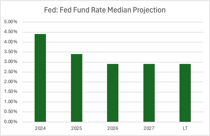 Using Fed projections we can see that after cutting interest rate by 0.50% to 5% the Fed also expects to cut rates by another 0.5% before the end of the year to 4.50% and then further reduce rates next year by another 1% toward 3.5%. The Fed also expects the longer term Fed Fund rate to be right around 3%.