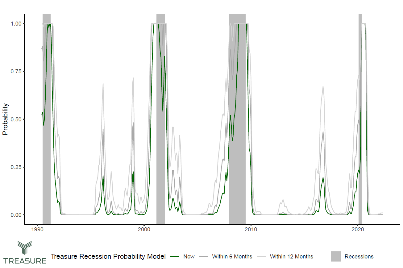 As we have shown, the Treasure recession model has done a pretty good job at identifying previous recessions ahead of time. Internally, this model helps Treasure optimize our clients’ cash management allocations and thereby enhances the returns we are able to deliver on their idle cash. We also hope this model provides business executives and finance leaders a reliable indicator they can track over time with our economic insights.