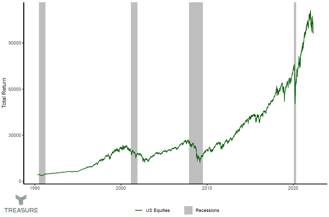 Treasure’s recession model achieves two key objectives: Consistency by removing any subjective bias (which tends to be prevalent in financial media) and insightful real-time information. Typically recession assessment relies on GDP data which is released with a lag, and it can take up to 8 months for recessions to be detected ex-post. Our model, on the other hand, is able to preemptively assess the odds of recessions ahead of time and in real-time, enabling us to detect them before they start occurring (the model also gives information about when a recession stops, which is helpful to detect the upswing in the business cycle).