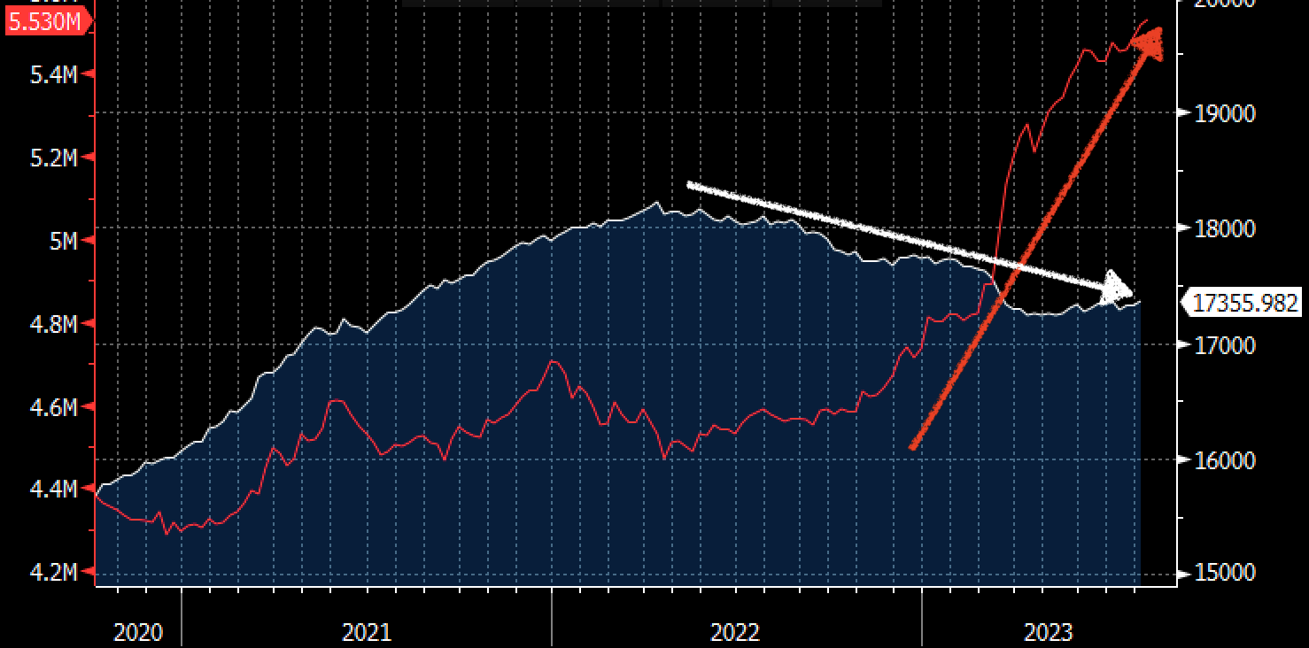 While the three points above are merely qualitative observations, we can assess their impact in a quantitative manner. As the chart below shows banks deposits have now decreased by more than $0.5 Trillion since their peak while Money Market Fund inflow have seen a commensurate increase. This clearly indicates the seismic shift taking place, businesses in particular are taking notice and are voting with their feet. The trend is clear: Bank deposits are shrinking while on the other side treasury products are gaining market share