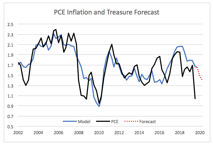 We can also look at this inflation question in a different way. We are fortunate at Treasure to have some inflation models. Those models help us not only understand the drivers of inflation but also enable us to make some forecast about its potential evolution in the near future. Using current data and having updated our models we can say that currently we aren’t expecting a lot of deflationary pressure. As the chart below shows our forecast for inflation as measured by PCE (the preferred Fed measure of inflation) to hover around 1.3pct by the end of the year. This is actually higher that the recent data. This observation again is far from pointing toward some widespread disinflationary pressure.