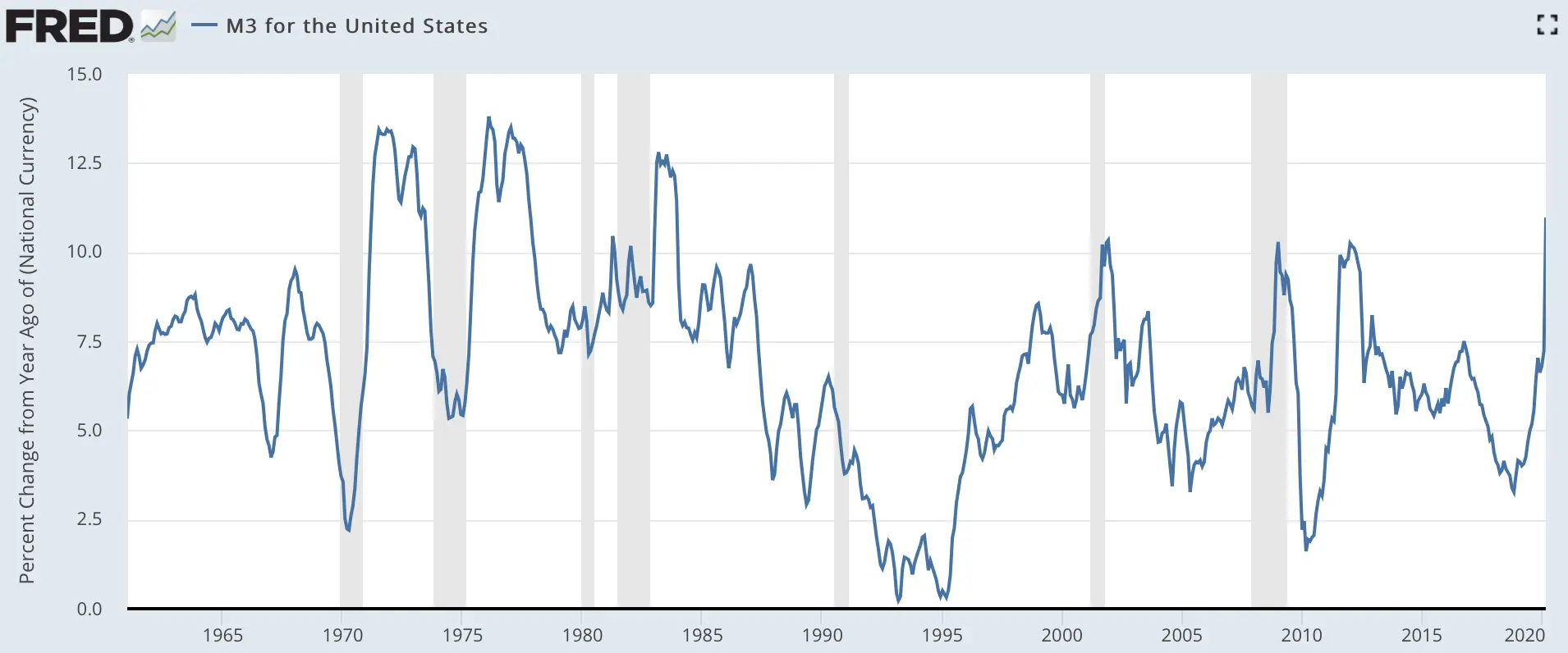 A last factor to take into consideration is the impressive growth in money supply as measured by M3 which is the broad money supply). It s currently growing at more than 10pct per year and reaching a 40yr high. While the relationship between money supply an inflation is far from perfect the pronounced growth in broad money supply should also act as a dampener on deflationary pressures.